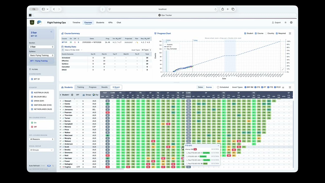 A live operations dashboard that extends FlightPro with the visibility your training unit needs. Every course, every student, one screen.